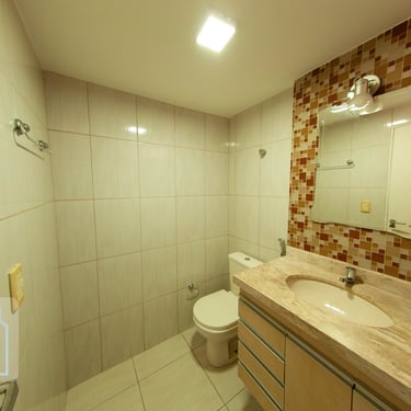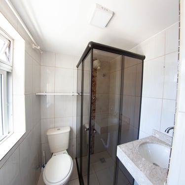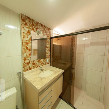 Além do banheiro da suíte o apartamento também possui um excelente banheiro social, bastante espaçoso.