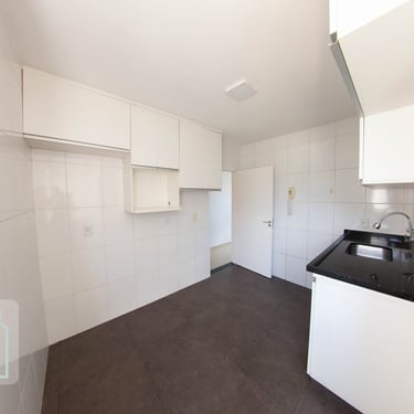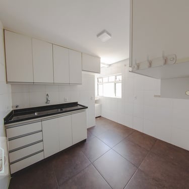 A cozinha é espaçosa, com espaço para fogão de 6 bocas, geladeira duplex e uma mesa de aproximadamente 90x90 cm.